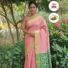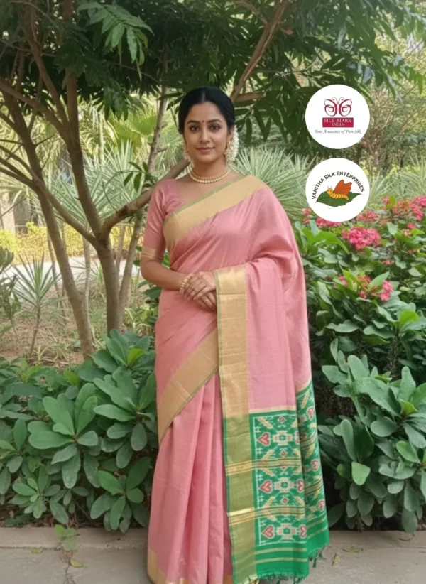 A soft blush pink pure handloom saree paired with a rich gold zari border for timeless grace. The vibrant green ikat pallu adds a striking contrast with traditional woven motifs. Light, elegant, and effortlessly classy—perfect for festive and traditional occasions. A beautiful blend of subtle charm and cultural richness in every drape.