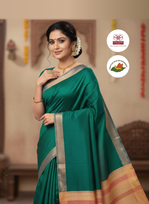 Crafted from luxurious pure silk, this saree features a rich emerald green hue that exudes sophistication with a smooth, lustrous finish. Adorned with an exquisite woven border in gold and warm saffron tones, enhancing its regal appeal with subtle sheen. The drape falls gracefully, providing a flattering silhouette that feels soft and comfortable against the skin, allowing for ease of movement. Ideal for festive occasions, weddings, or formal gatherings, this saree promises to elevate your style quotient to new heights.