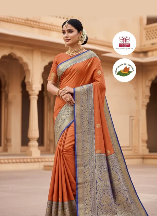 Crafted from luxurious silk, this exquisite saree features a rich terracotta hue complemented by elegant gold motifs that dance across the fabric. The saree showcases a stunning contrast border adorned with intricate zari work and a delicate blue detailing that adds a regal touch. Designed for a perfect drape, it offers a graceful silhouette while feeling soft and lightweight against the skin, ensuring comfort for hours of wear.Ideal for festive occasions, weddings, or formal gatherings, this saree elevates your wardrobe with its timeless elegance and sophisticated charm.