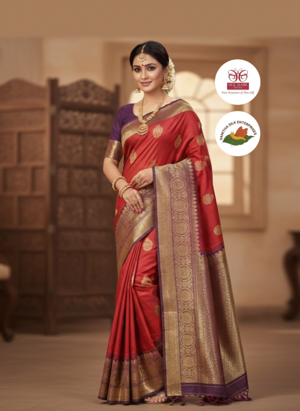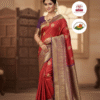 Crafted from luxurious silk, this exquisite sari features a vibrant red and deep purple palette adorned with intricate gold zari work, creating a rich aesthetic.