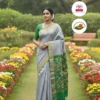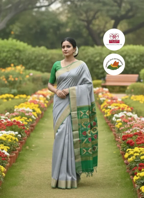 This graceful silver grey silk saree features a smooth pure handloom weave with a soft, elegant shine. Its contrasting green pallu is adorned with vibrant Ikat motifs that bring a lively ethnic touch. The subtle gold zari border enhances its refined and classic appeal. Perfect for cultural events and daytime celebrations, offering a fresh and sophisticated look.